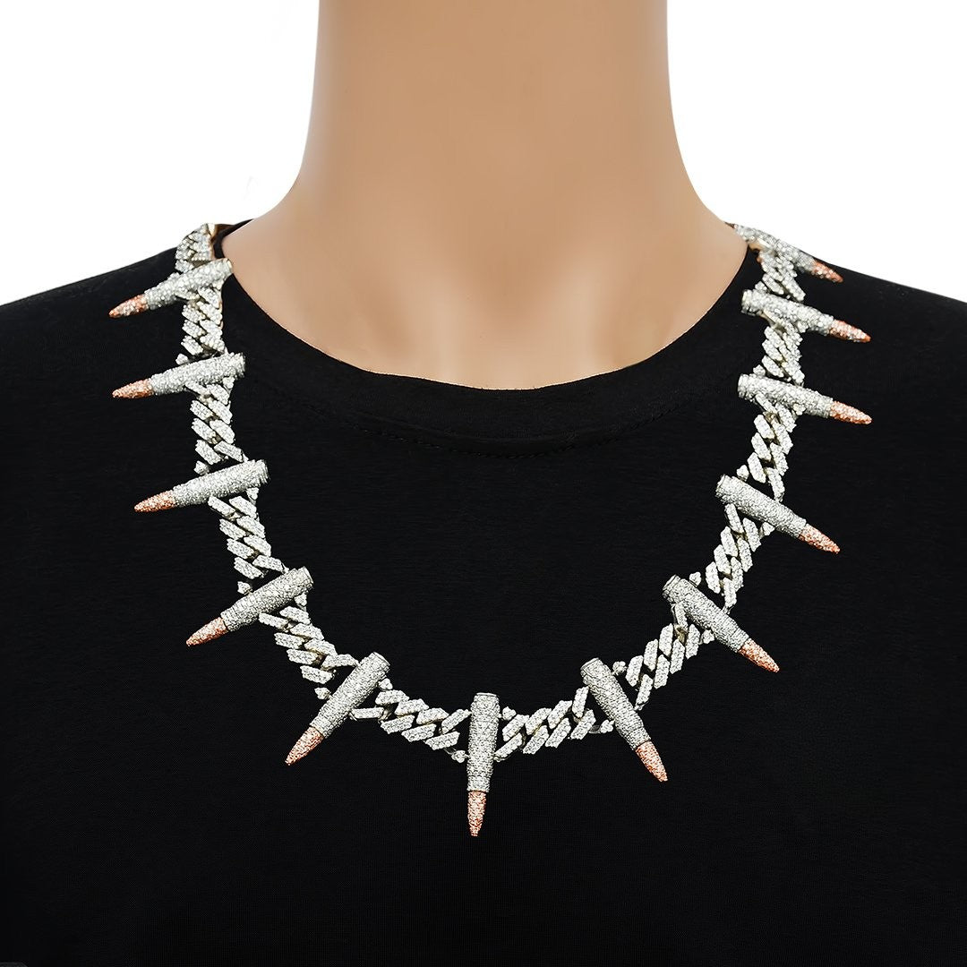 The Diamond Artillery cuban is a finely handcrafted Avianne Custom creation. This necklace casted in pure 14k white gold and weighs 374 grams. This piece is Inspired by artillery. Throughout the decades artillery such as .50 cals, shells and other weaponry have been embedded in durable, unique holsters. This work of art is set with 38.67 carats of round cut VVS diamonds. It's a must have for your collection!